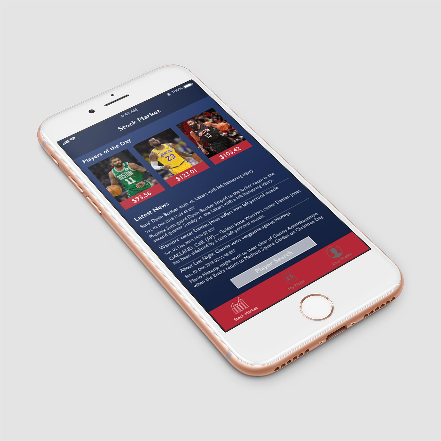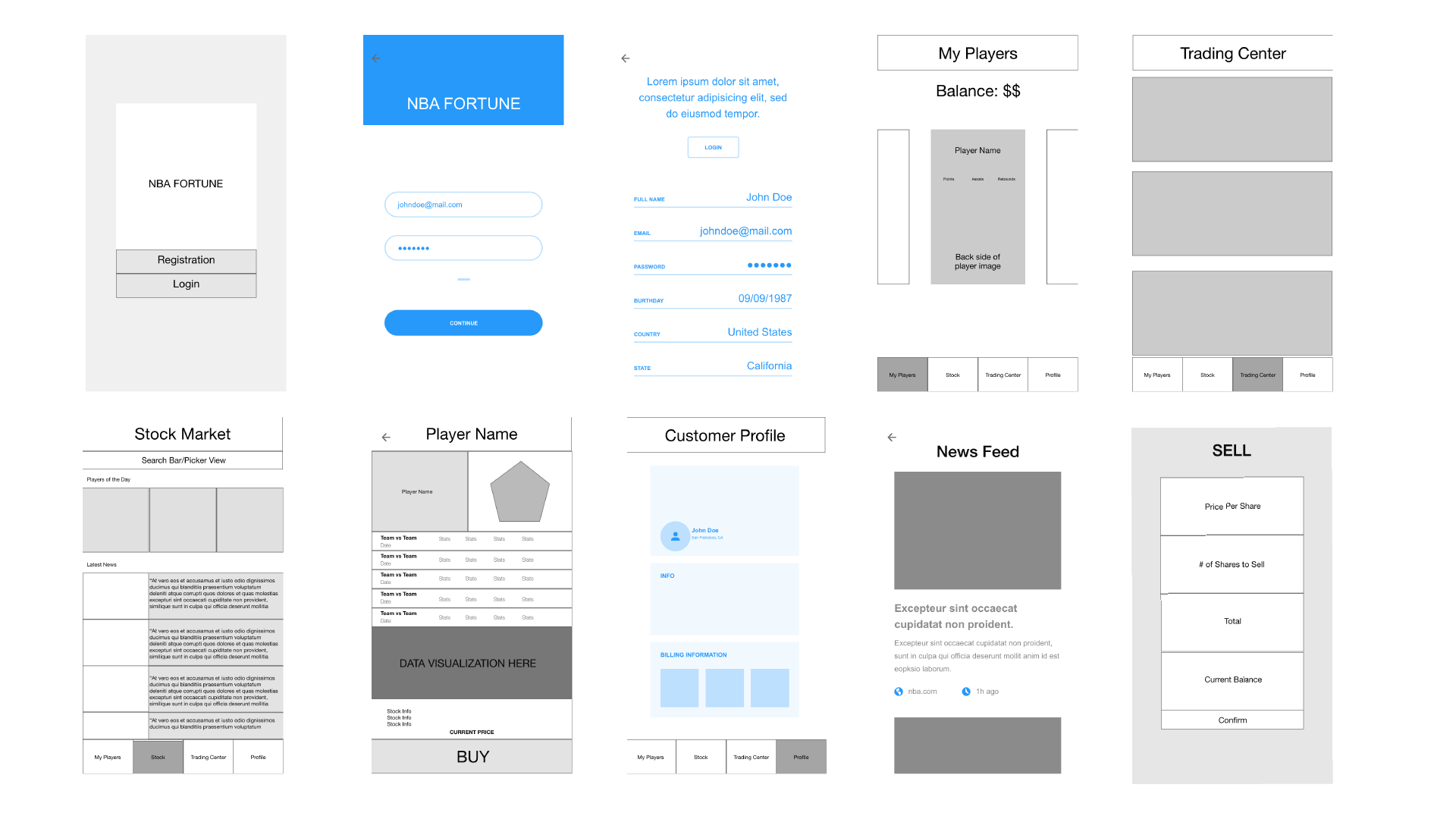 The final designs for the app. Using the design principles I set for myself and the wireframes as a guide, I created a system to contain the app's four most important features: My Players, Trading Center, Stock Market, and Player Profile.