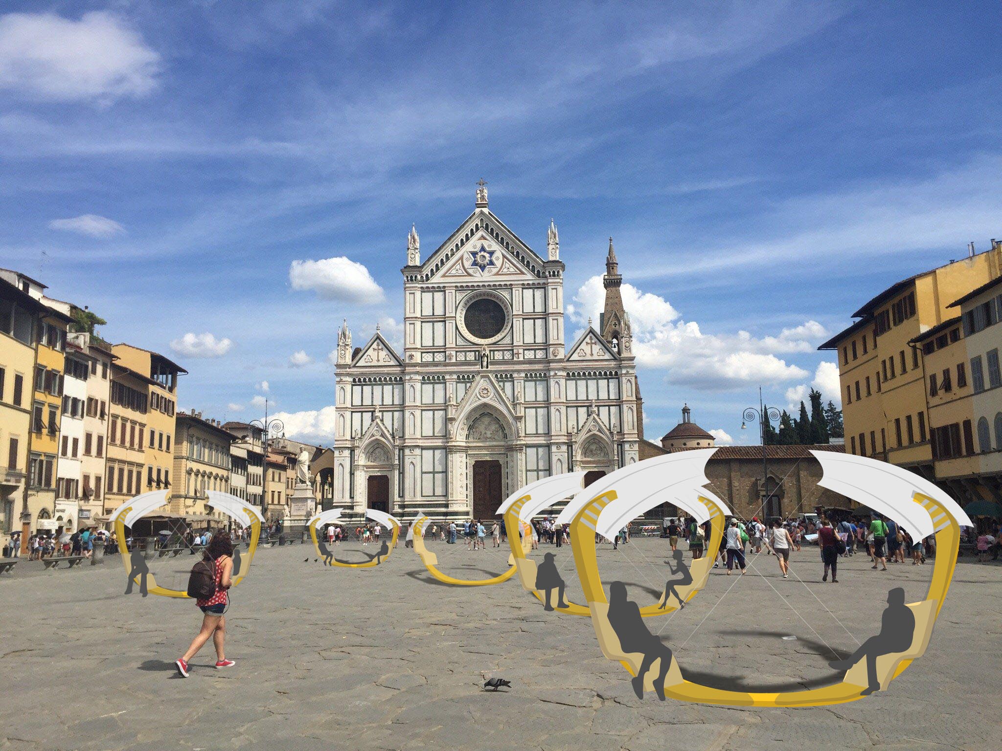 Designed in an elongated U-shape, these chairs would be dispersed throughout a plaza, creating pockets of space which break up the established movement patterns in a square.